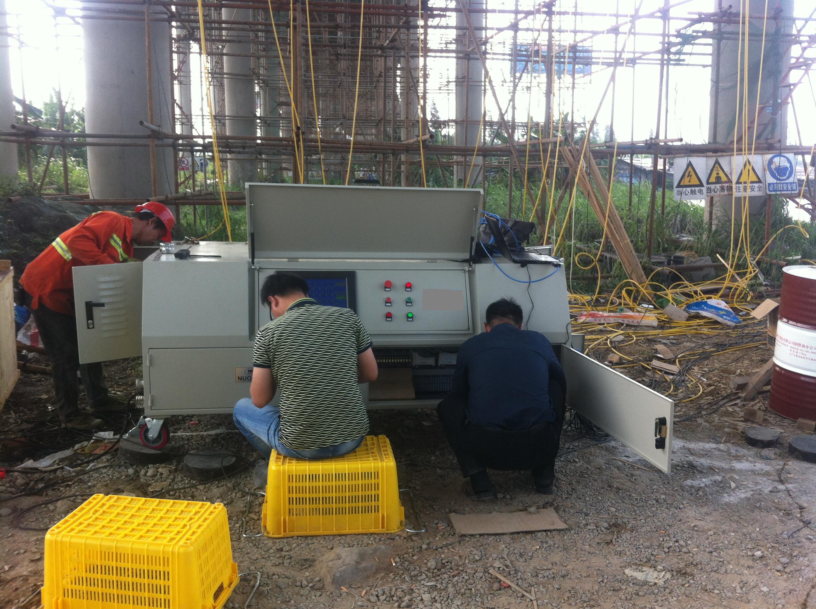 2012年我公司為該橋梁提供智能連續(xù)千斤頂同步系統(tǒng)。經(jīng)過精科液壓技術(shù)團(tuán)隊(duì)與工程技術(shù)人員經(jīng)過多次技術(shù)交流結(jié)合大橋特點(diǎn)采用基于液壓傳動(dòng)、計(jì)算機(jī)控制及現(xiàn)場總線技術(shù)---智能連續(xù)千斤頂同步系統(tǒng),通過采用自動(dòng)連續(xù)頂推千斤頂,自動(dòng)連續(xù)頂推泵站及PLC主控臺(tái),主控臺(tái)對(duì)各泵站及千斤頂進(jìn)行集中控制,保證所有千斤頂啟動(dòng)、施力、運(yùn)行同步。在岸側(cè)設(shè)置頂推平臺(tái)、順橋至對(duì)岸設(shè)置多個(gè)臨時(shí)橋墩,在每個(gè)臨時(shí)墩左右兩側(cè)各安置一套頂推裝置。各個(gè)頂推裝置有獨(dú)立的液壓泵站提供動(dòng)力、由獨(dú)立的分控制器實(shí)施前端控制,并通過現(xiàn)場總線與主控制器通訊。頂推裝置在計(jì)算機(jī)系統(tǒng)的同一控制下,調(diào)節(jié)各個(gè)支墩的高度、根據(jù)支撐力的大小實(shí)現(xiàn)頂推力和速度的綜合控制,確保各個(gè)支墩的頂推力與其摩擦力相應(yīng)。